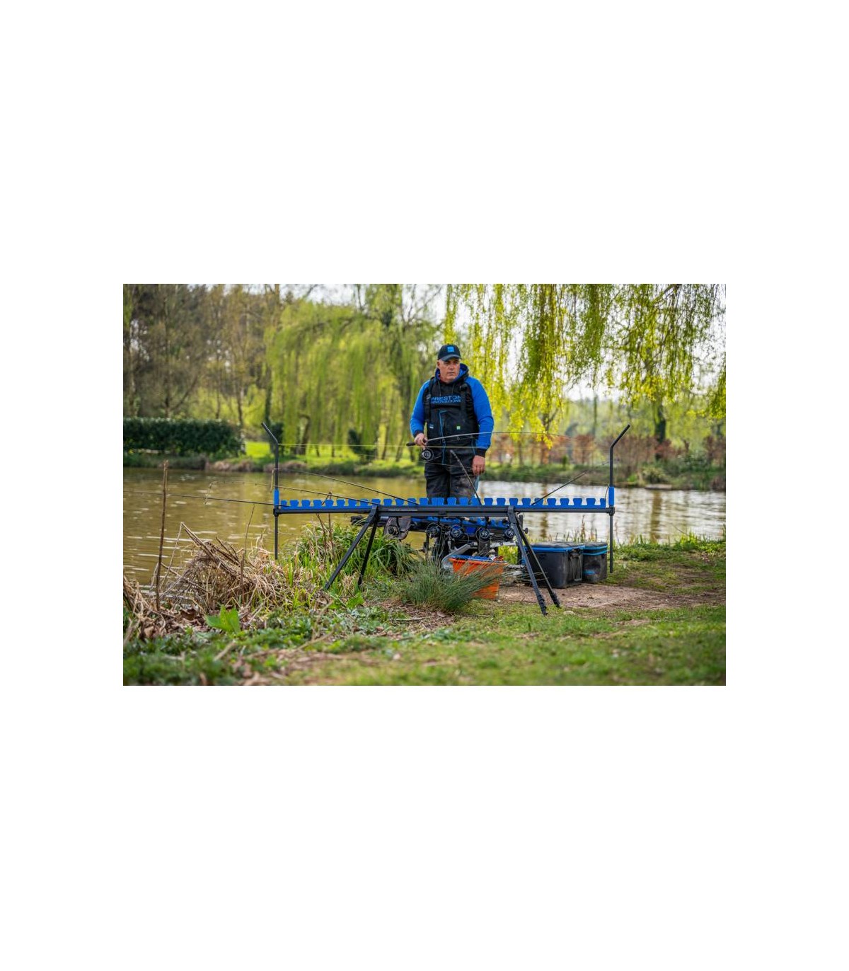 Un posatoio multiuso, progettato per ospitare un gran numero di canne o kit di pesca, con l'ulteriore vantaggio di indicatori di distanza integrati. Misurati esattamente a 2 metri, gli indicatori di distanza consentono al pescatore di misurare con precisione la distanza senza dover lasciare il paniere, ed è ideale anche quando il terreno rende impossibile l'utilizzo degli indicatori di distanza tradizionali.