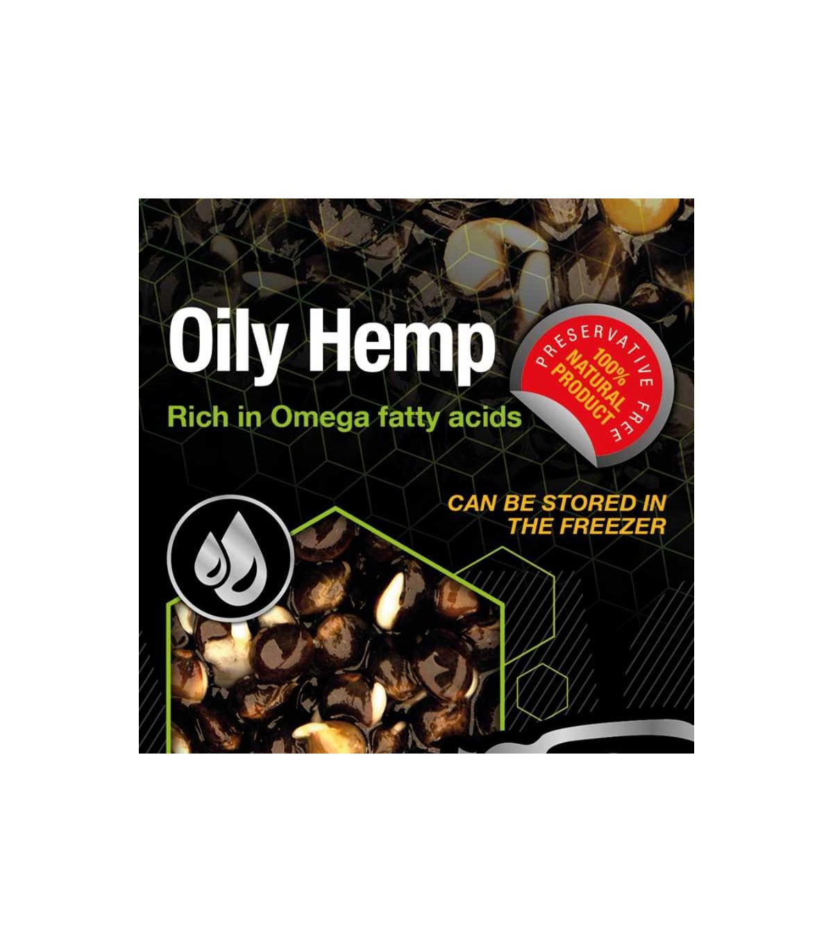 Usando semi di canapa francese di grandi dimensioni di altissima qualità, olio potenziato per un profilo di acidi grassi essenziali Omega 3 e 6 migliorato Oily Hemp è l'ingrediente perfetto per il mangime per tappeti o per la miscela di spod, in grado di leccare le goccioline di olio per attirare le carpe da tutti i livelli della colonna d'acqua e creare punti piatti per darti i segni vitali di nutrire le carpe nelle tue aree.